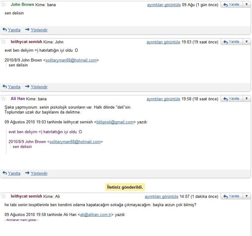 Şimdi bu da ne dediğinizi duyar gibiyim. Benim ise cevabım bana gelen maillerden biri... Hani soru soruluyor, derdini anlatan oluyor, halimi hatrımı soran oluyor ama bu başıma ilk defa geliyor. İnsanların benimle ne alıp veremedikleri var anlamıyorum.