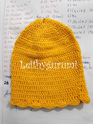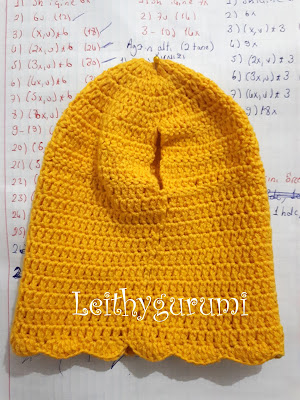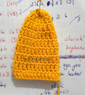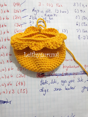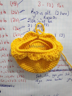 (1x, 1hdc, 1dc, aynı yere 3dc, 1dc, 1hdc)*3, 9x (1x, 1hdc, 1dc, aynı yere 3dc, 1dc, 1hdc)*3 yapıyoruz. Ortadan ikiye katlayıp birbirine diktikten sonra başa uygun şekilde görsellere bakarak dikiyoruz.